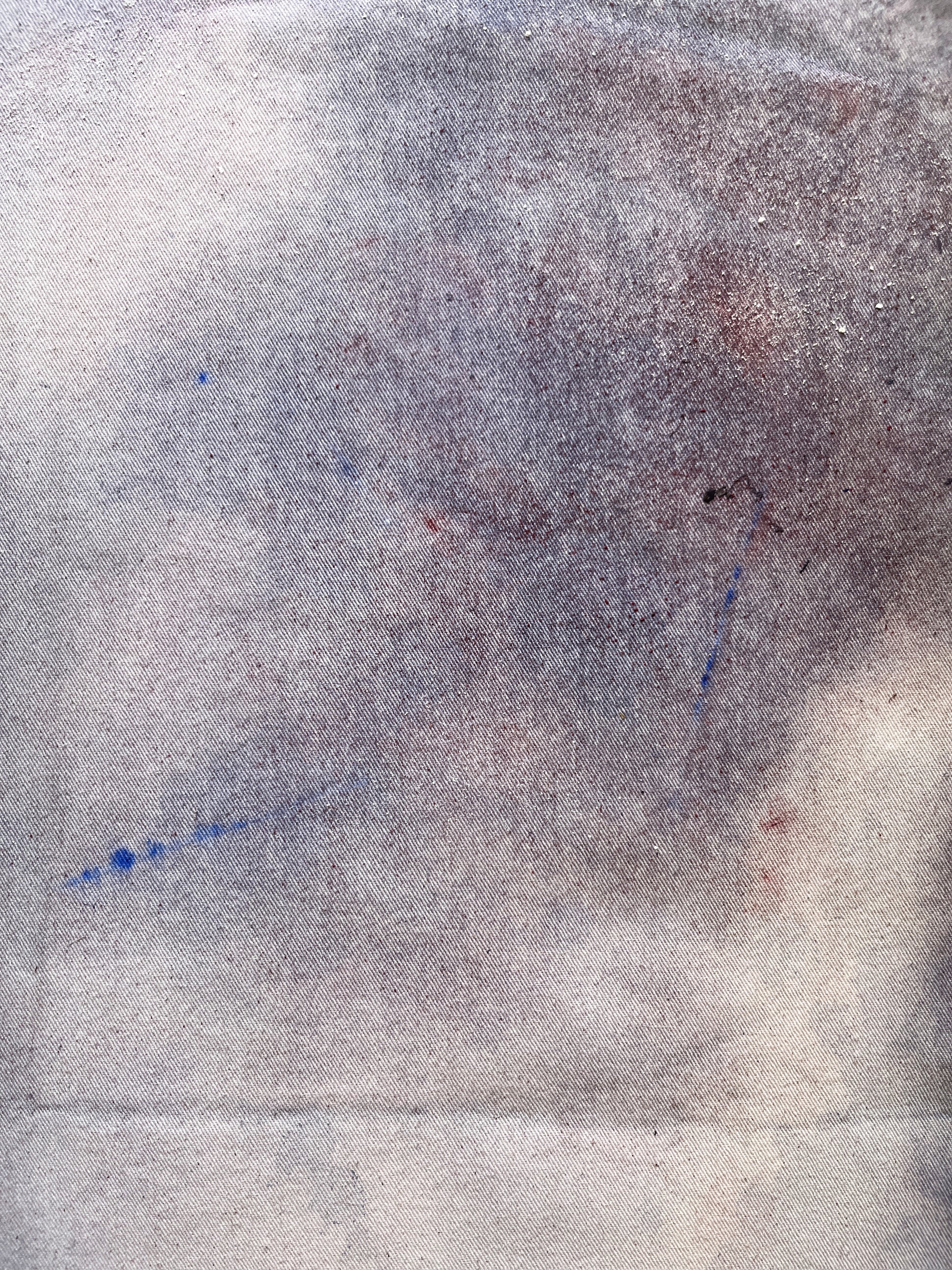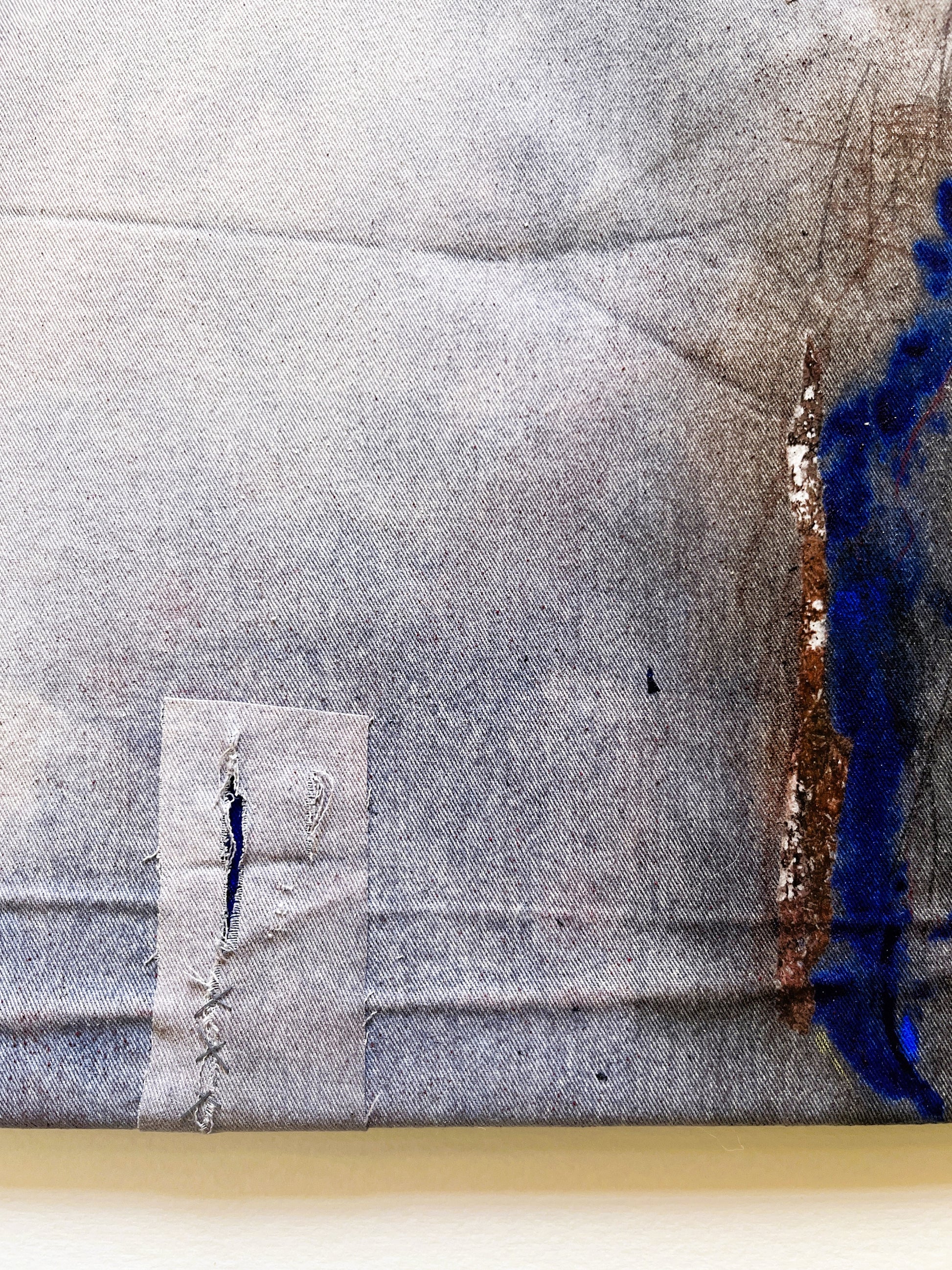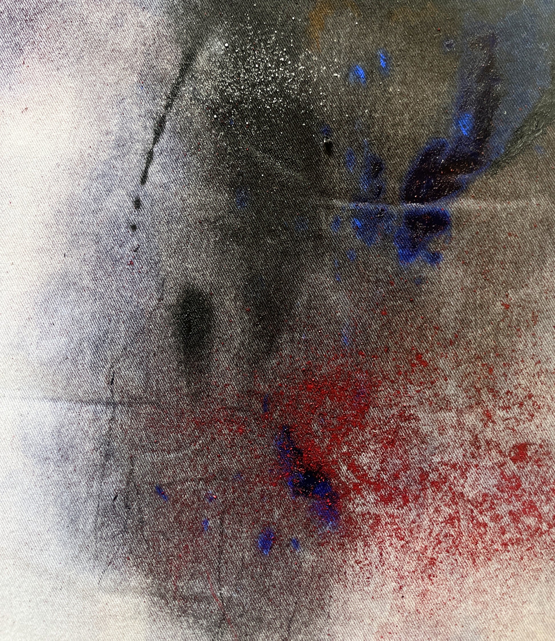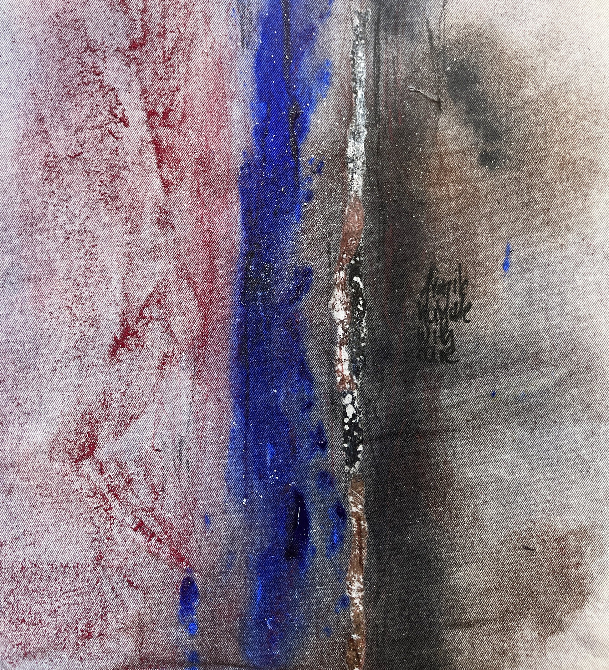 Spuren des Zufalls und des Unvollkommenen werden in diesem Werk getragen. Pigmente, die sich nicht vollständig auflösen, sich absetzende Farben, Falten und Linien im Gewebe, die wie Risse oder Staub wirken – all das bleibt sichtbar und wird Teil der Sprache. Nichts wird geglättet oder verborgen.