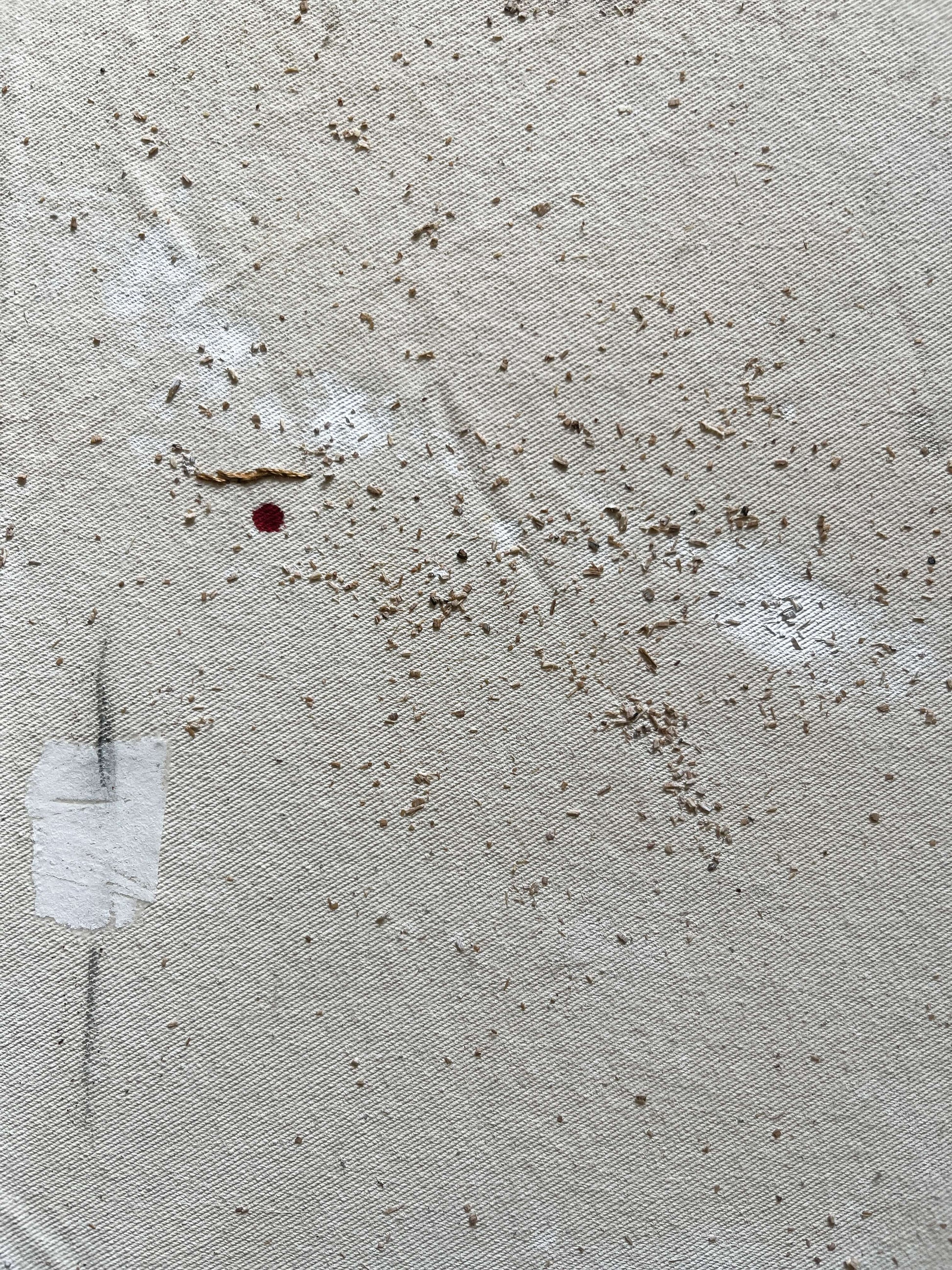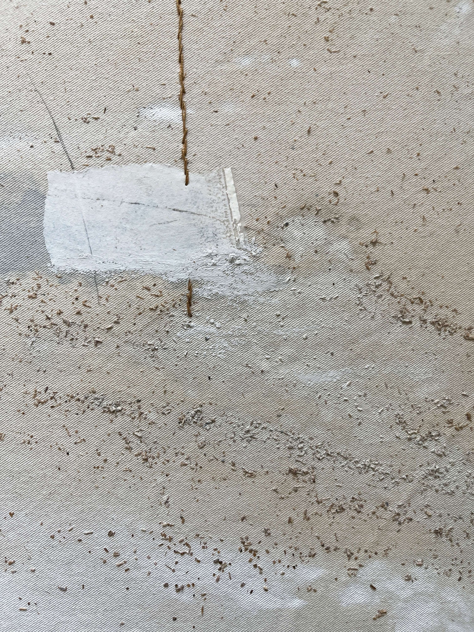 Dieses Werk wagt die Reduktion. Auf den ersten Blick erscheint die Fläche beinahe leer, wie ein ruhiges Feld aus gebrochenem Weiß und Beige. Doch je näher man tritt, desto mehr entfalten sich die Schichten. Man entdeckt Spuren von Falten im Stoff, fragile Stickereien, Collage-Fragmente, feine Übermalungen und das unberechenbare Spiel von Holzmehl, das wie sedimentierte Erinnerung auf der Oberfläche liegt.